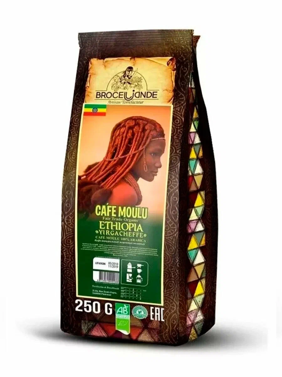 250 Кофе Броселлианд Эфиопия Йоргачефф в зёрнах мягкий пакет 250 гр 14 шт